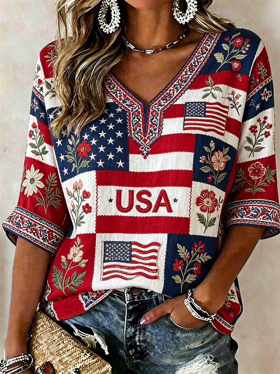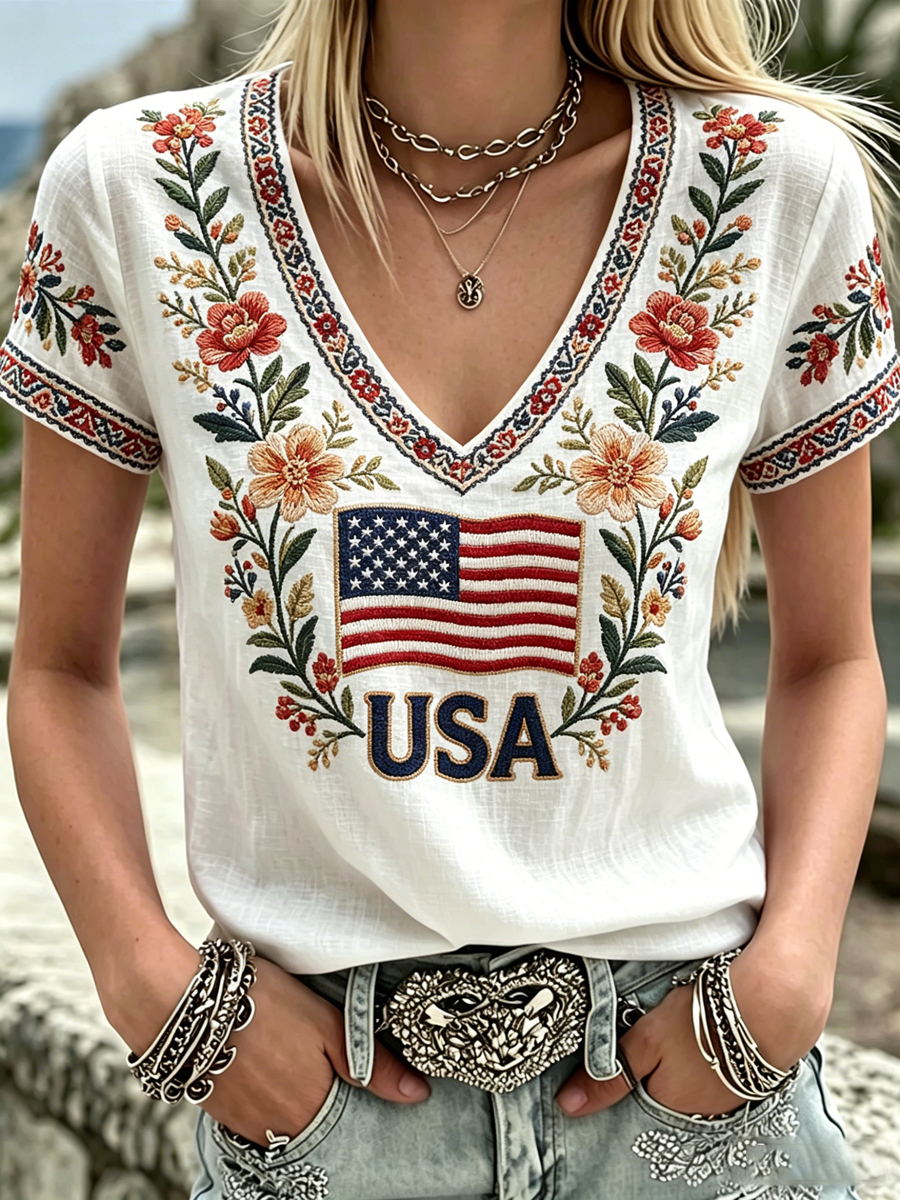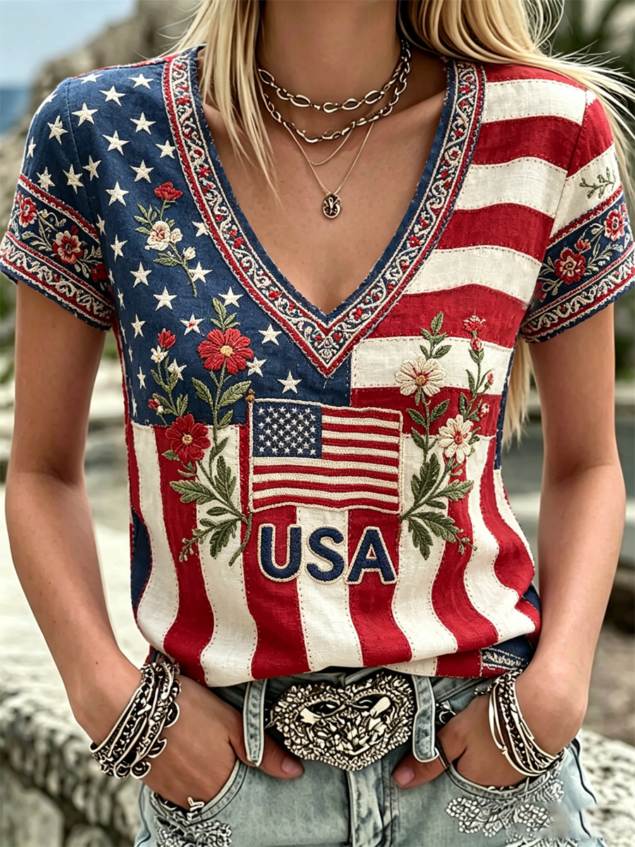 Women's America Floral Print V-Neck Casual T-Shirt
