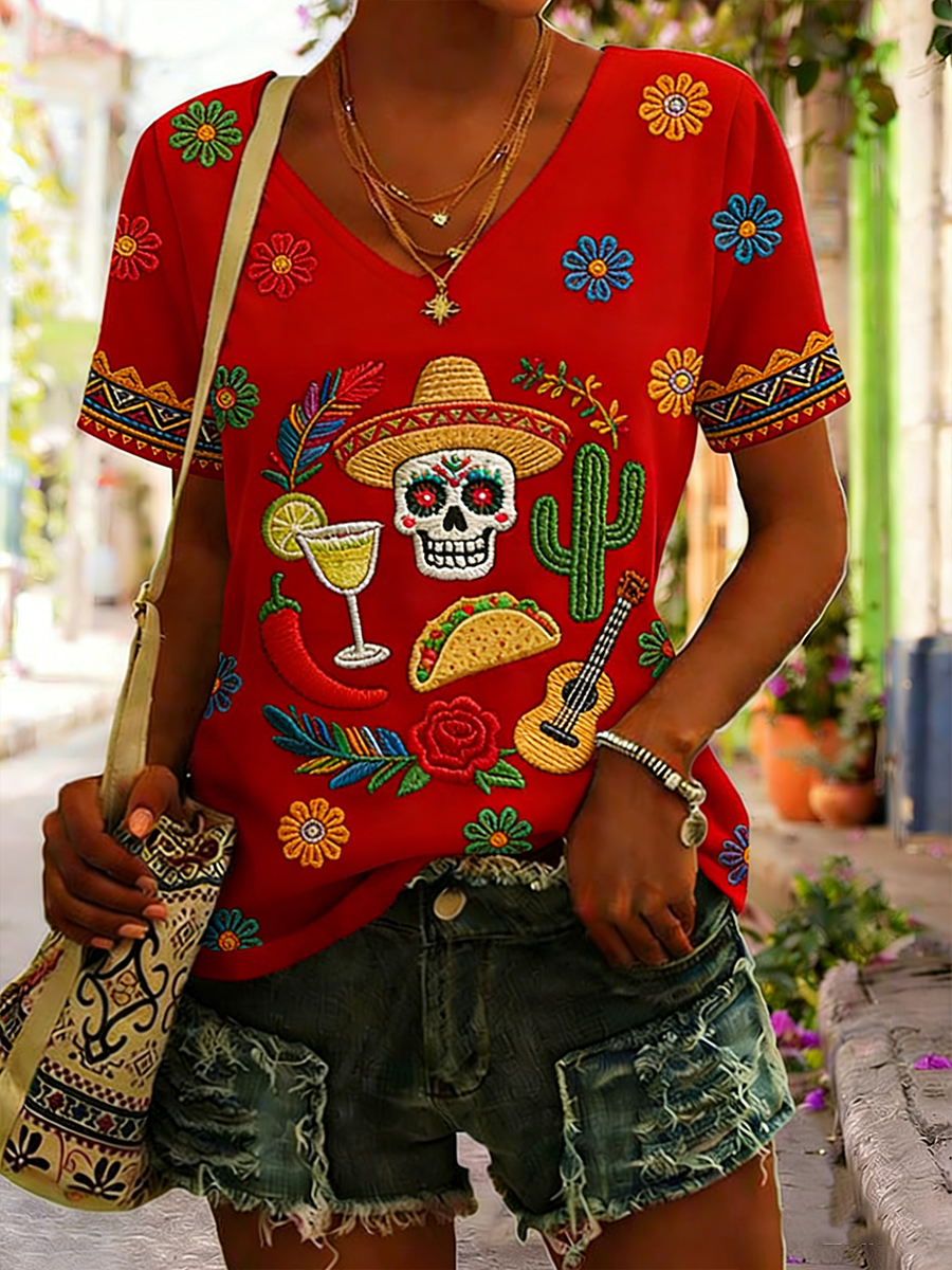 Women's Viva La Fiesta! Print Casual V-Neck Tee