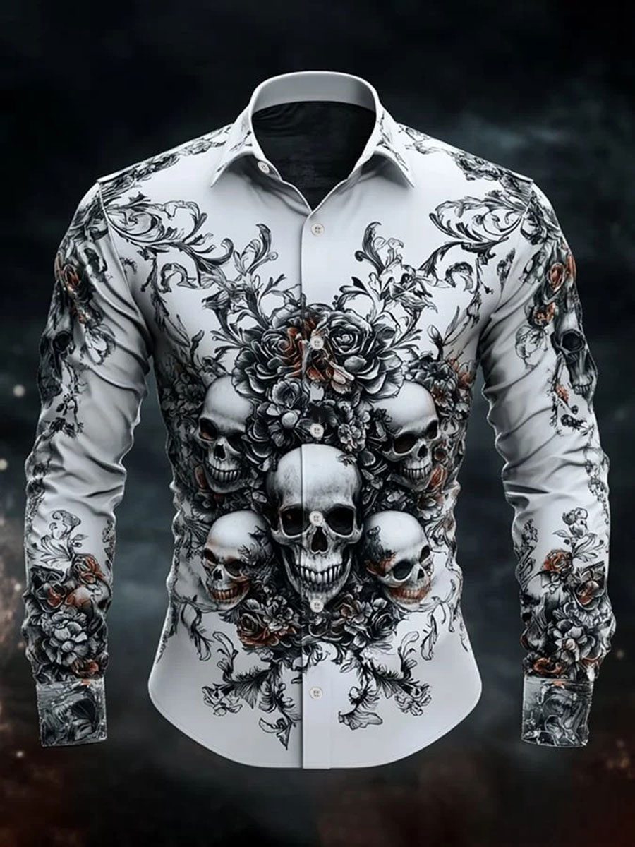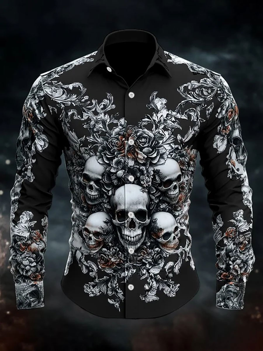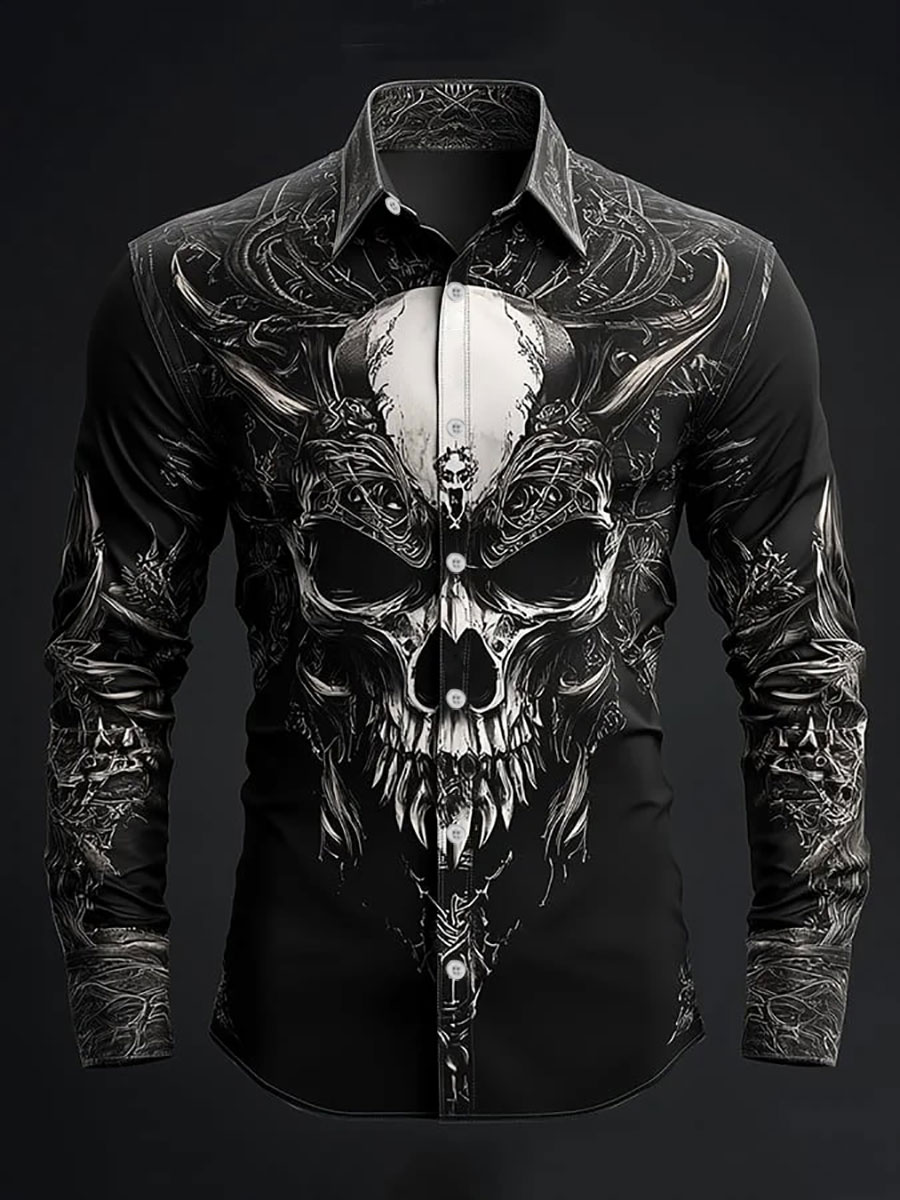 Men's Retro Casual Skull Print Long Sleeve Shirt