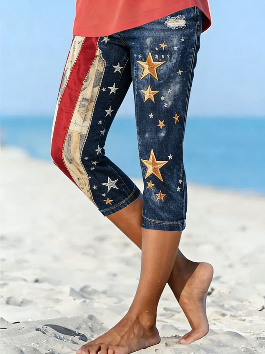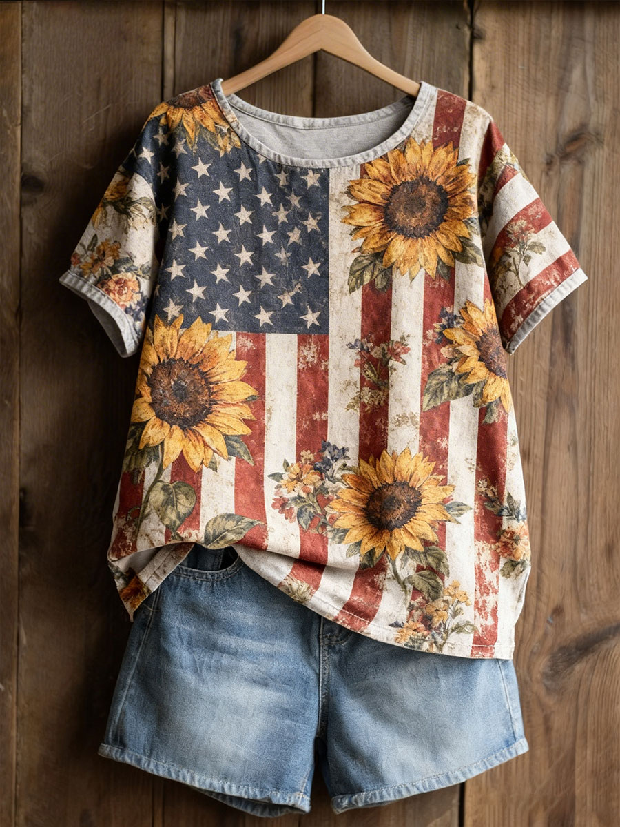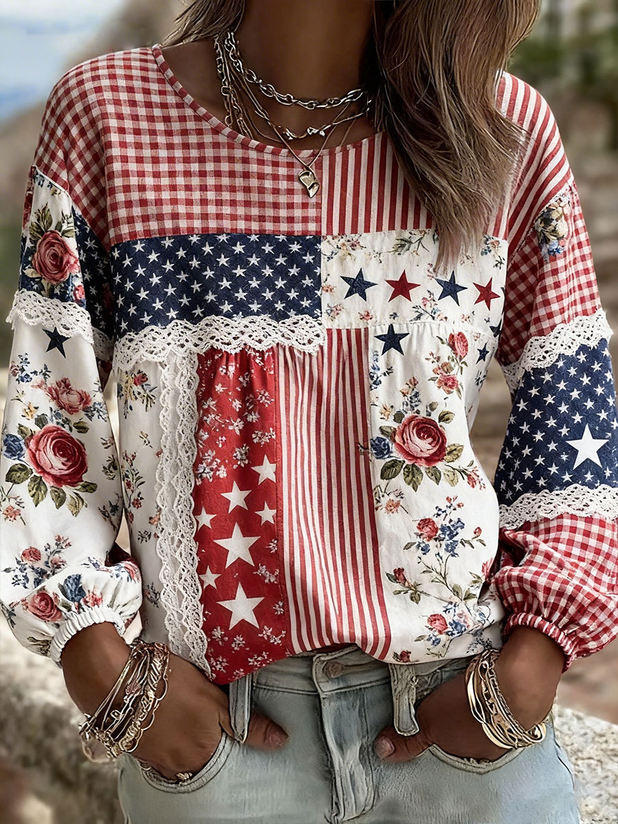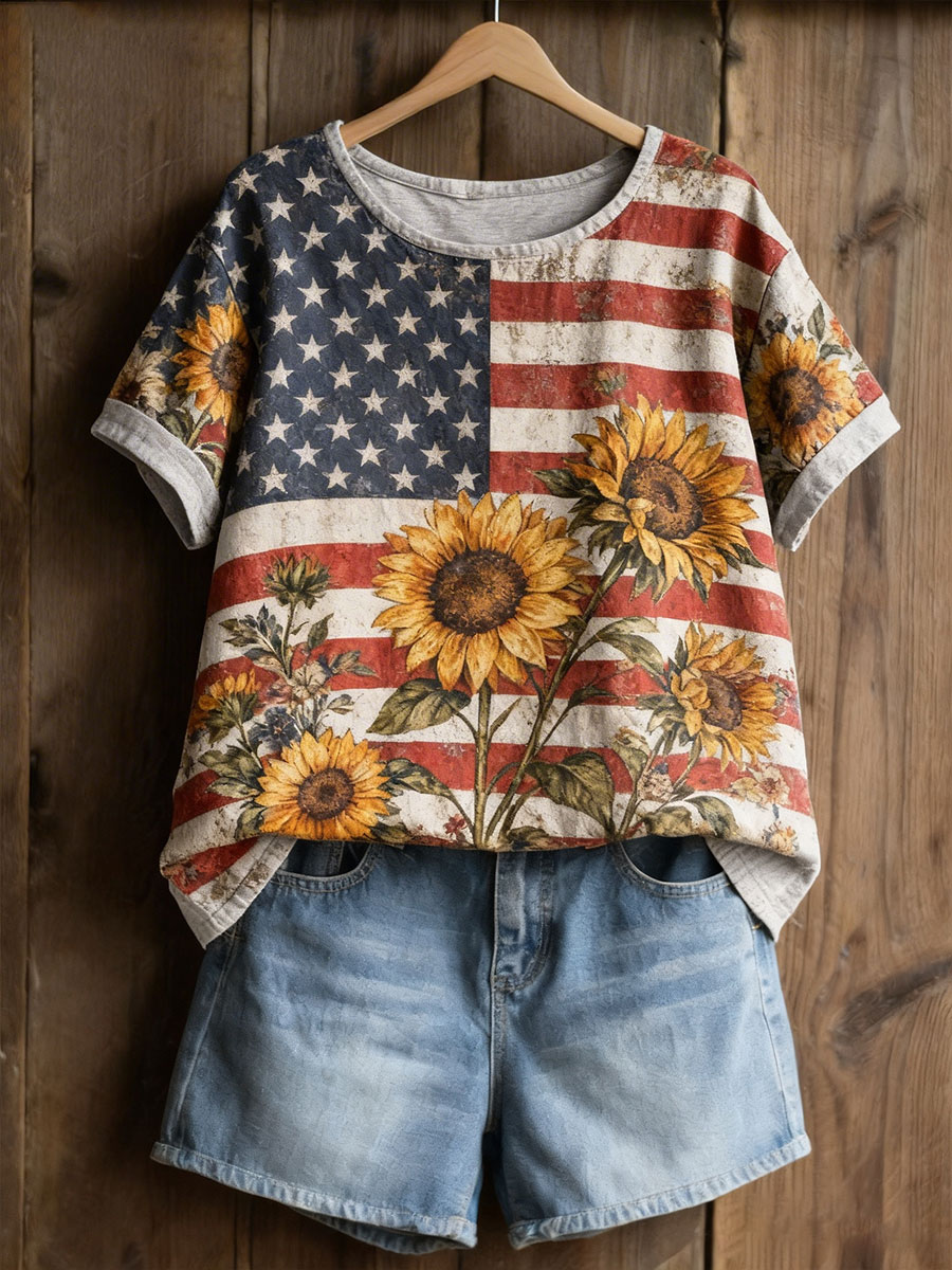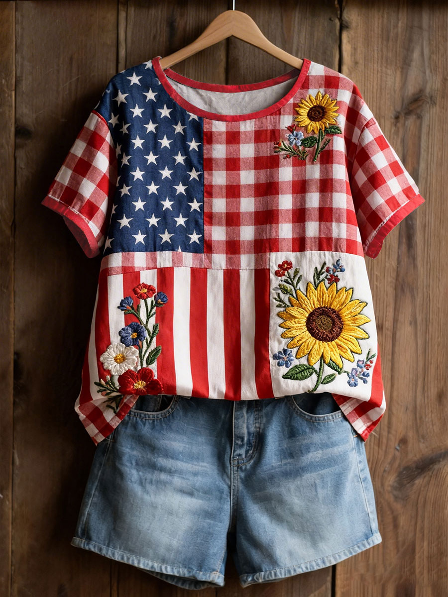 Women's American Floral Patchwork Print Casual T-Shirt