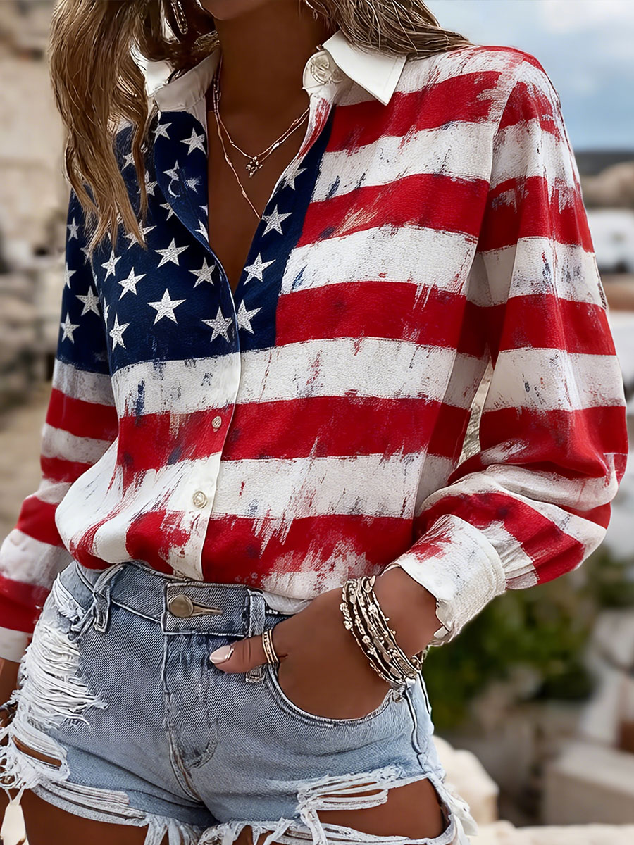Women's USA Inspired Floral Embroidery Pattern Linen Blend Shirt