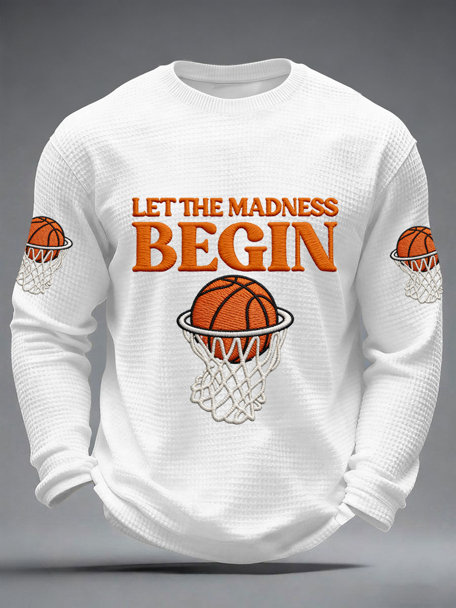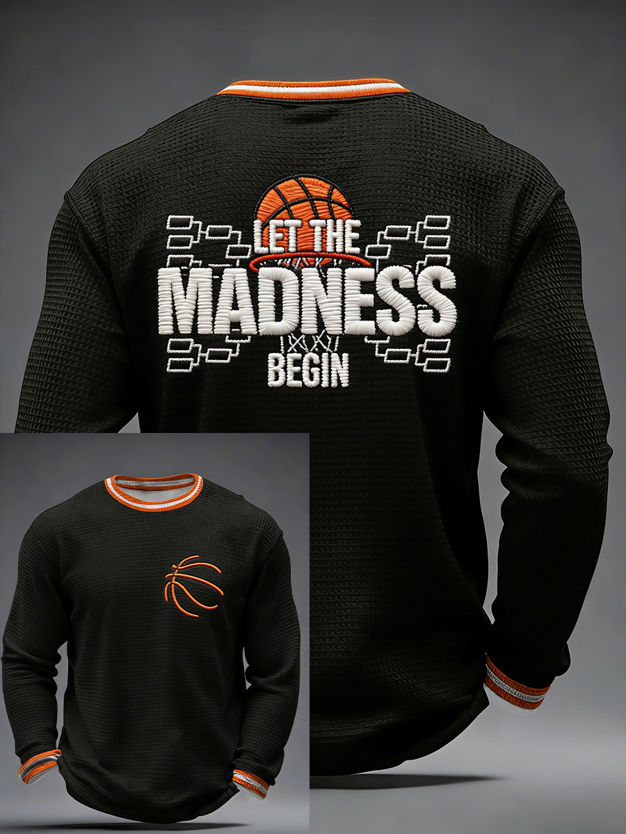 Men's Let The Madness Begin Print March Madness Basketball Lovers Casual Waffle Long Sleeve T-Shirt