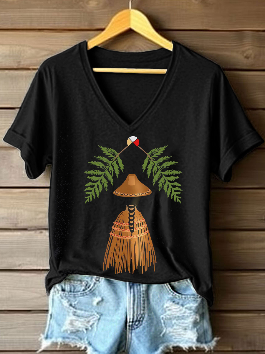 Women's Indigenous Girl Print V-Neck Tops