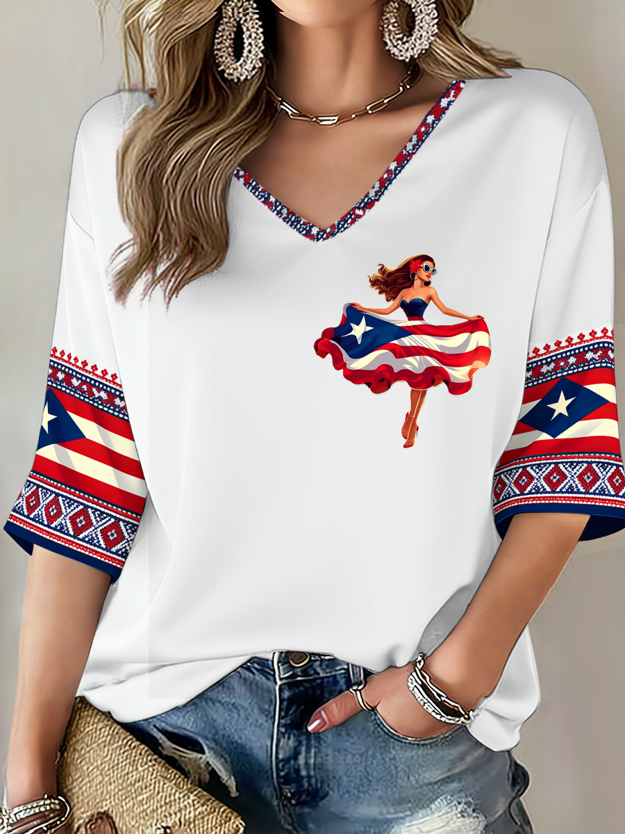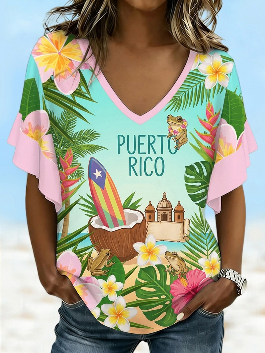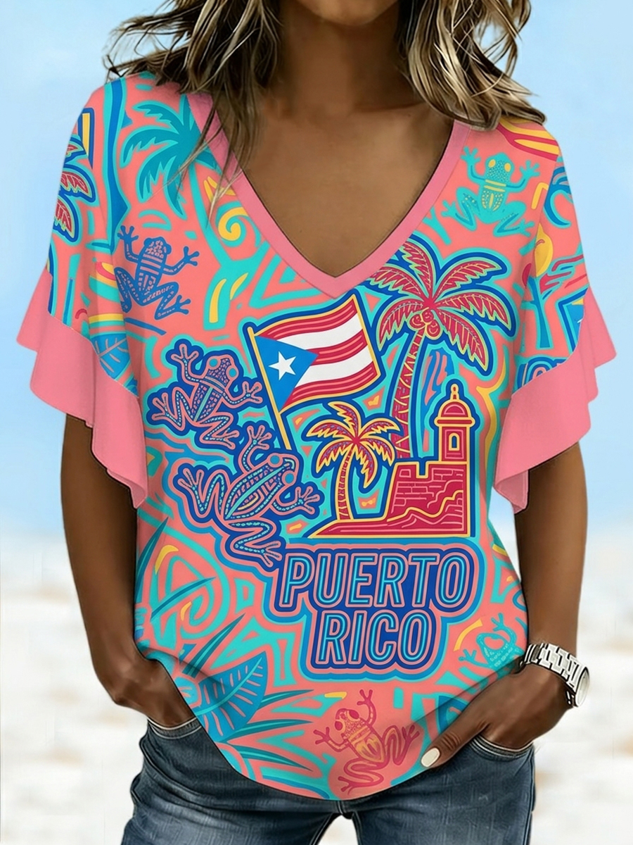 Women's Puerto Rico Printed Mid-length Sleeves V-Neck T-Shirt
