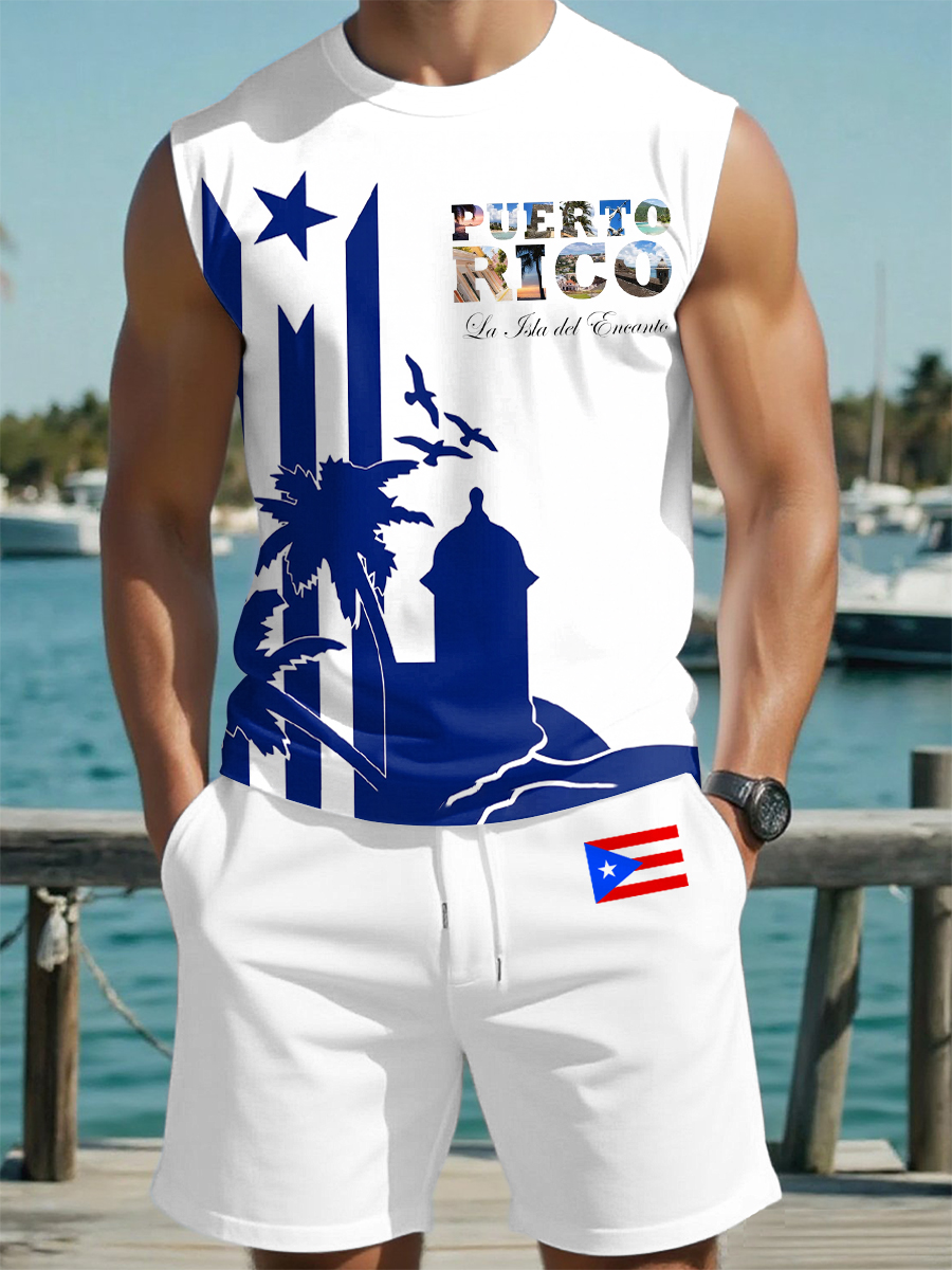 Men's Puerto Rico Print Vacation Vest Top And Shorts Set
