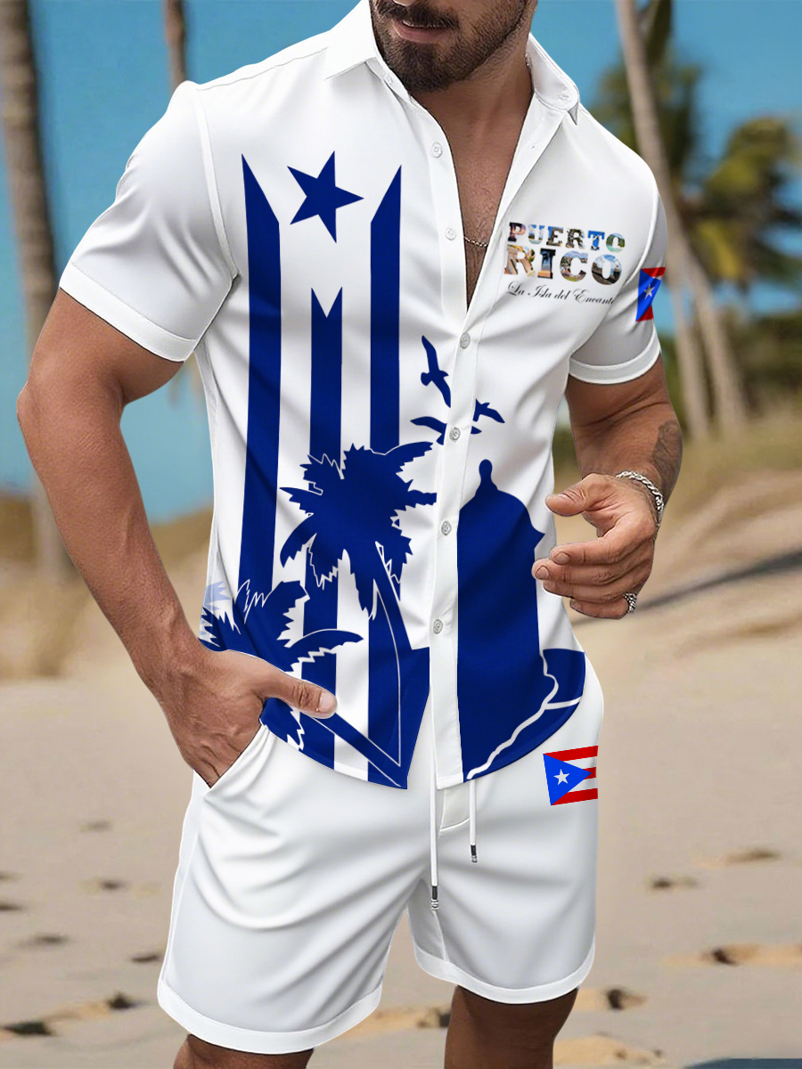 Men's Puerto Rico Print Vacation Shirt And Shorts Set