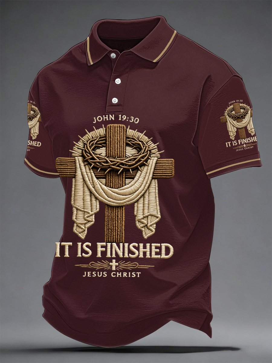 Men's He Is Risen It’s Finished Jesus Christian Cross Print Casual Polo