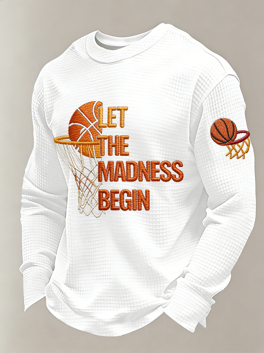 Men's Let The Madness Begin Print March Madness Basketball Lovers Casual Waffle Long Sleeve T-Shirt