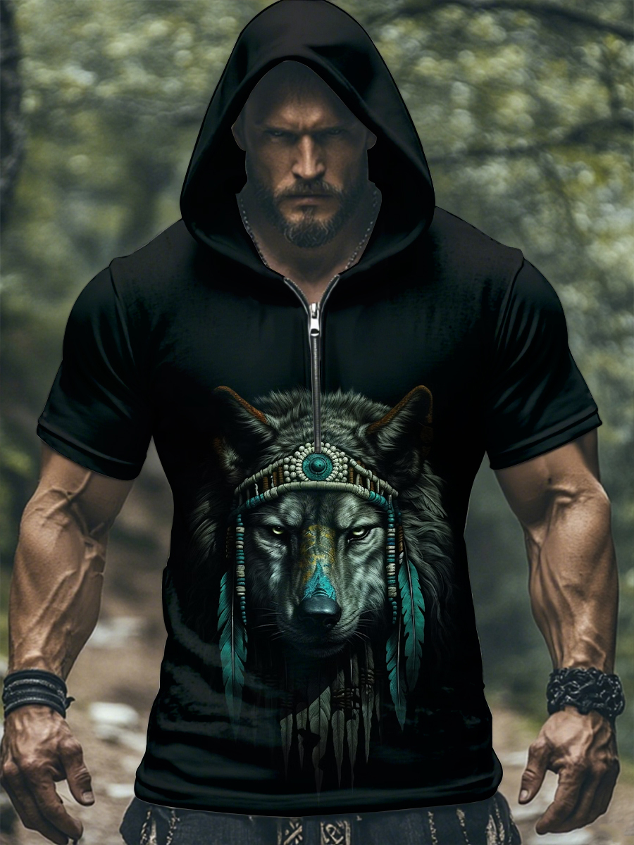 Men's Native American Wolf Hooded Short Sleeve T-Shirt
