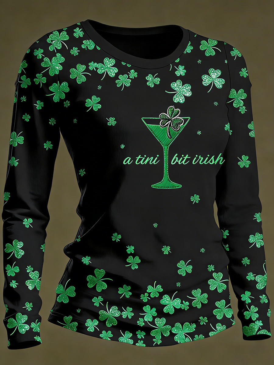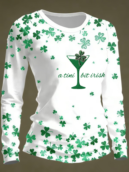 Women's Funny St. Patrick's Day Shamrock Art Round Neck Long Sleeve T-shirt