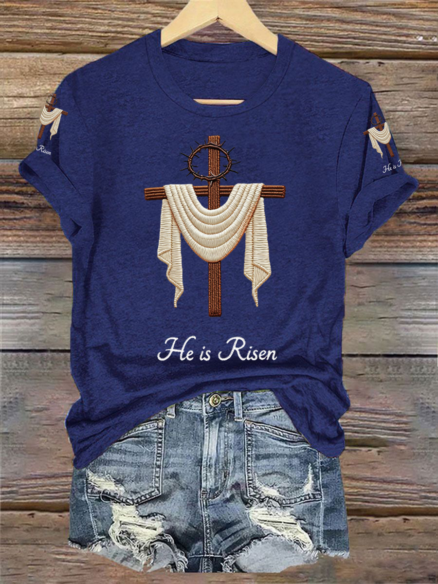 Women's He Is Risen Jesus Christian Cross Print V-Neck Tee