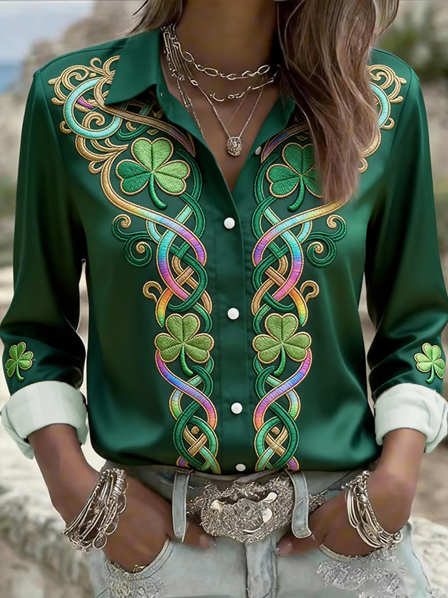 Women's St. Patrick's Day Celtic Knot Shamrock Print Casual Long-Sleeve Shirt