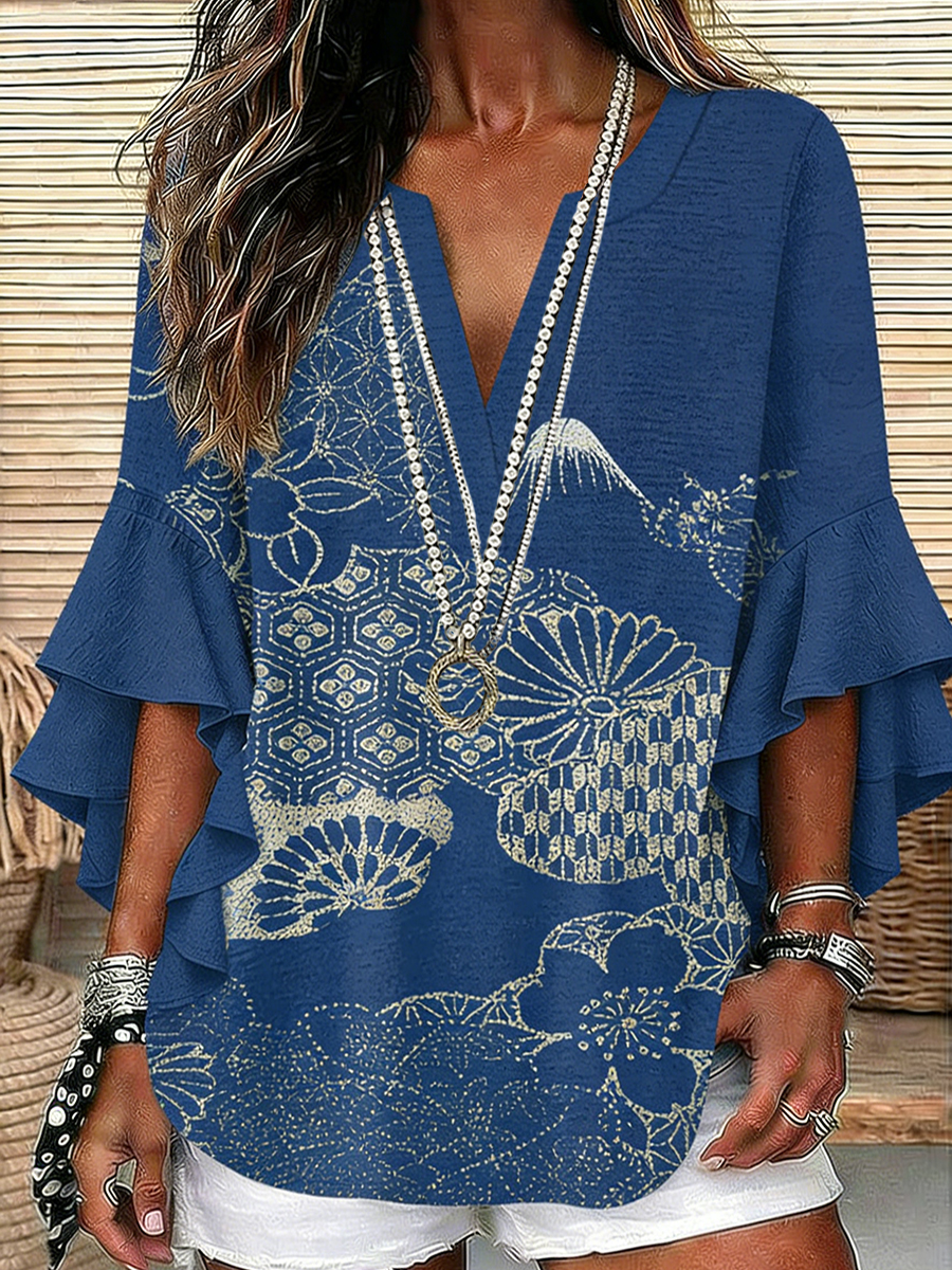 Women's Vintage Art Printed V-Neck Casual Linen Shirt